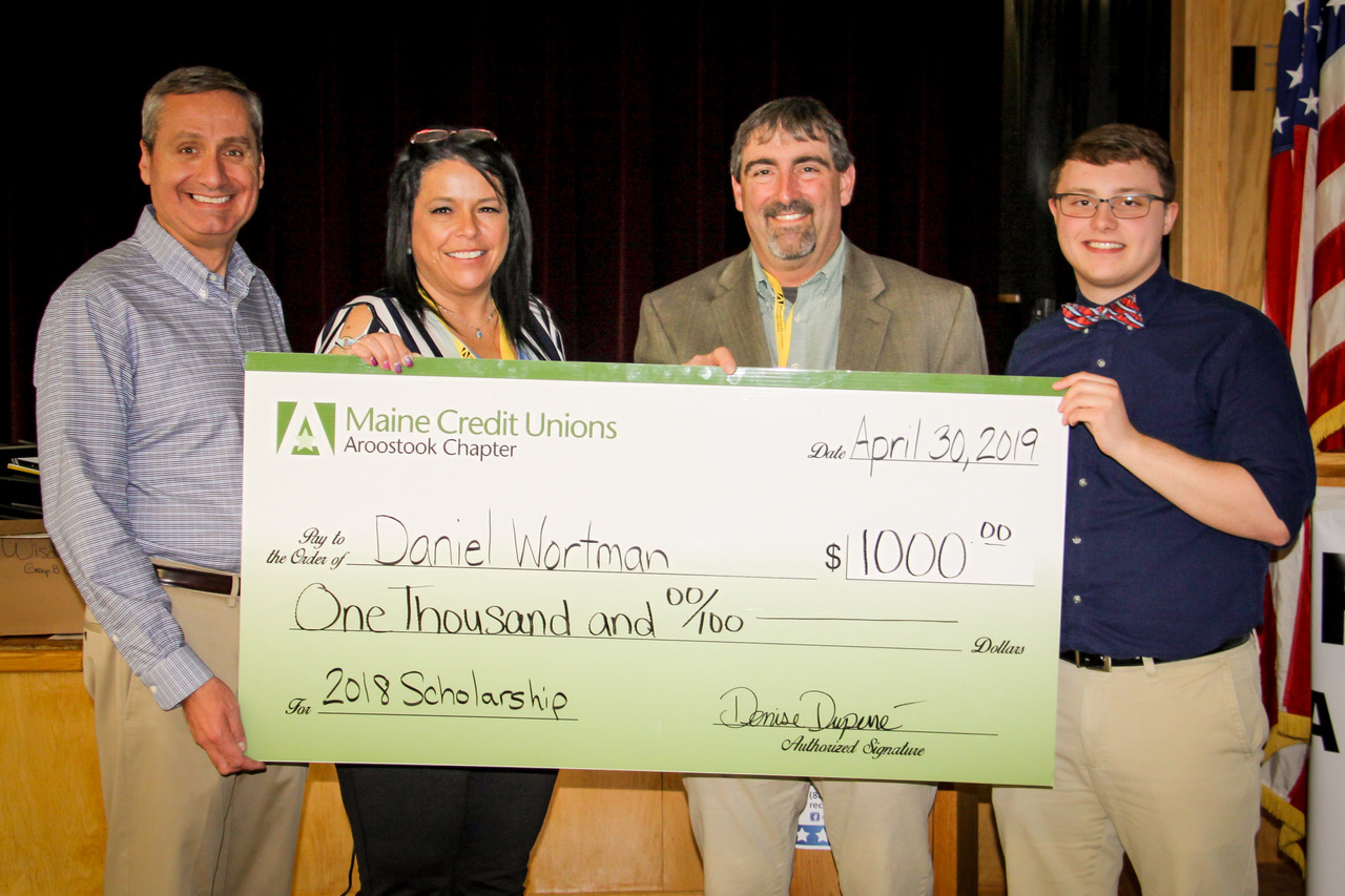 On-site at the 2019 Financial Fitness Fair to present the 2018 $1,000 scholarship were David Desjardins, President/CEO of Acadia Federal Credit Union; Denise Duperré, Chairperson—Aroostook Chapter of Maine Credit Unions; Dan Bagley, Executive Vice President of The County Federal Credit Union, and scholarship earner Daniel Wortman of Ashland Community High School.