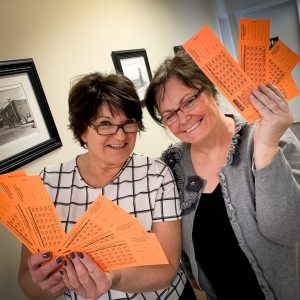 Acadia FCU employees Patty Michaud and Angie McBreairty display ‘Daily Cash’ raffle tickets. This is typically the biggest fundraiser of the year for Acadia FCU’s contribution to the Maine Credit Union’s Campaign for Ending Hunger.
