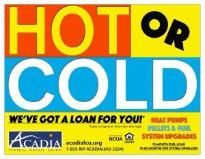 Keep warm OR stay cool with a loan from Acadia Federal Credit Union! Install a new heat pump or update your existing heating system and finance for 12 to 60 months at a low APR*! If you’re looking to purchase pellets, coal or heating oil, you can borrow for up to 12 months at the same rate!
